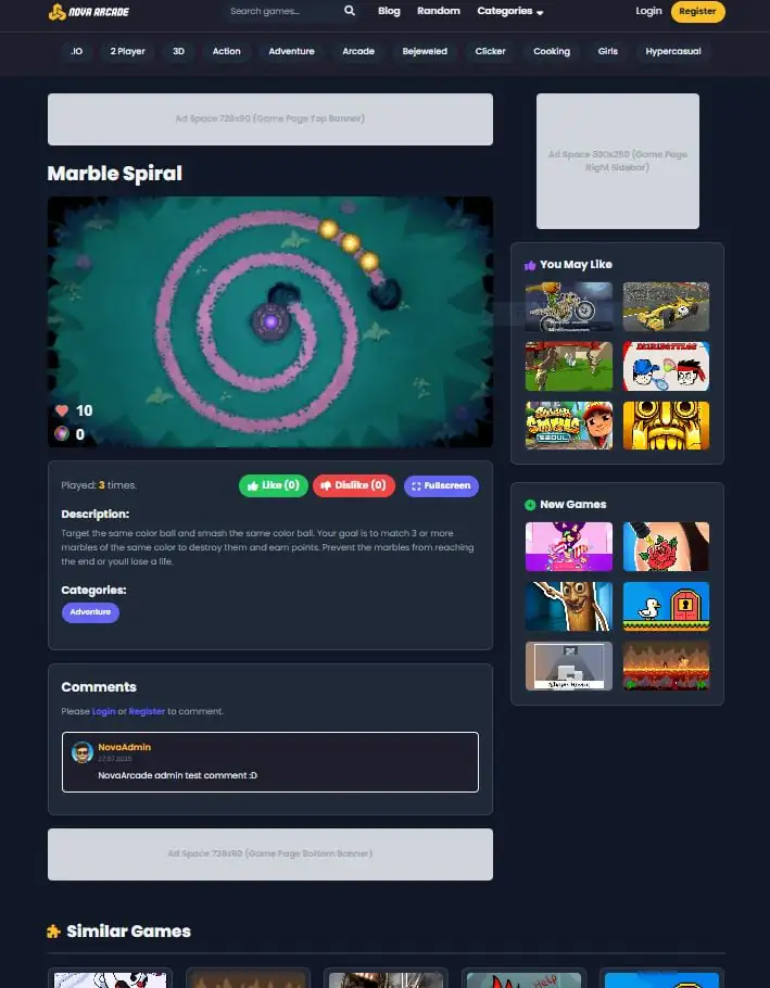 Nova Arcade is a lightweight yet powerful standalone HTML5 Game Portal CMS built with modern PHP (7.4+) and Tailwind CSS. It enables you to launch a fully functional and monetizable game website within minutes โ no advanced coding skills required.
