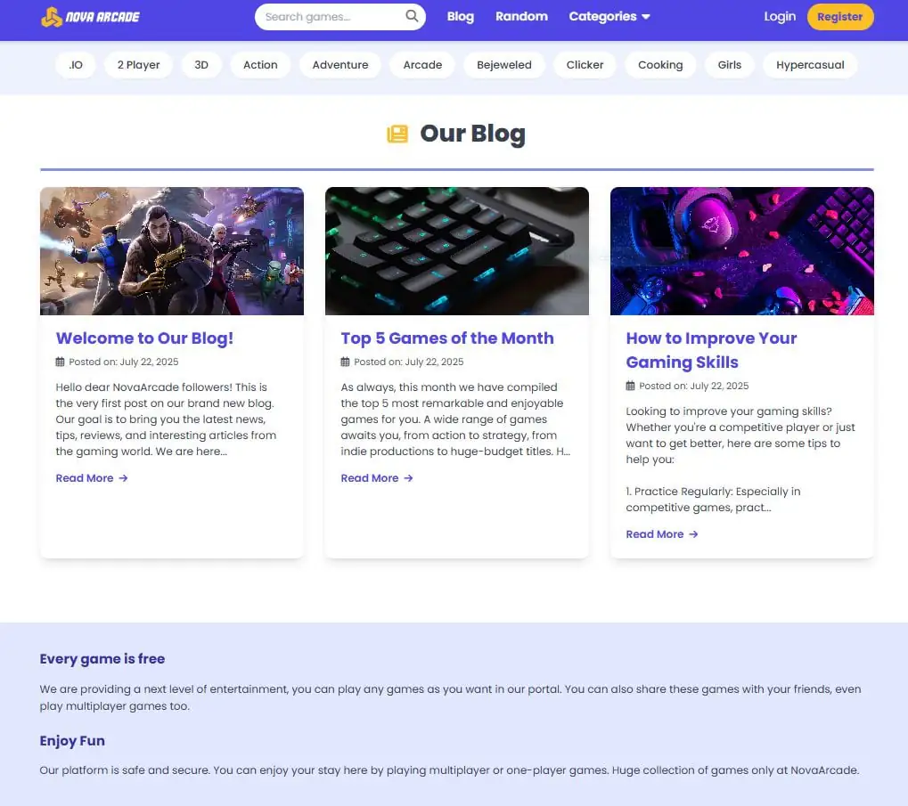 With a modern, responsive design powered by Tailwind CSS, a secure admin panel, blog system, built-in ad manager, and flexible layout themes โ Nova Arcade is your all-in-one solution to build, manage, and scale a successful game portal.