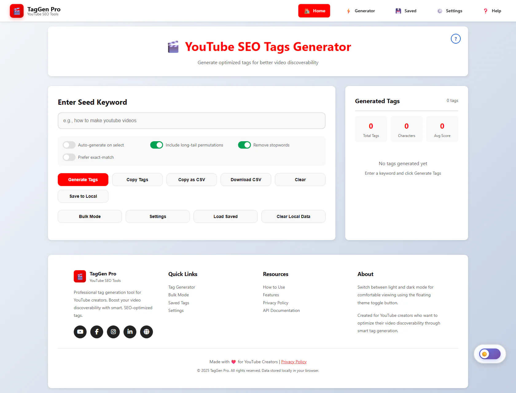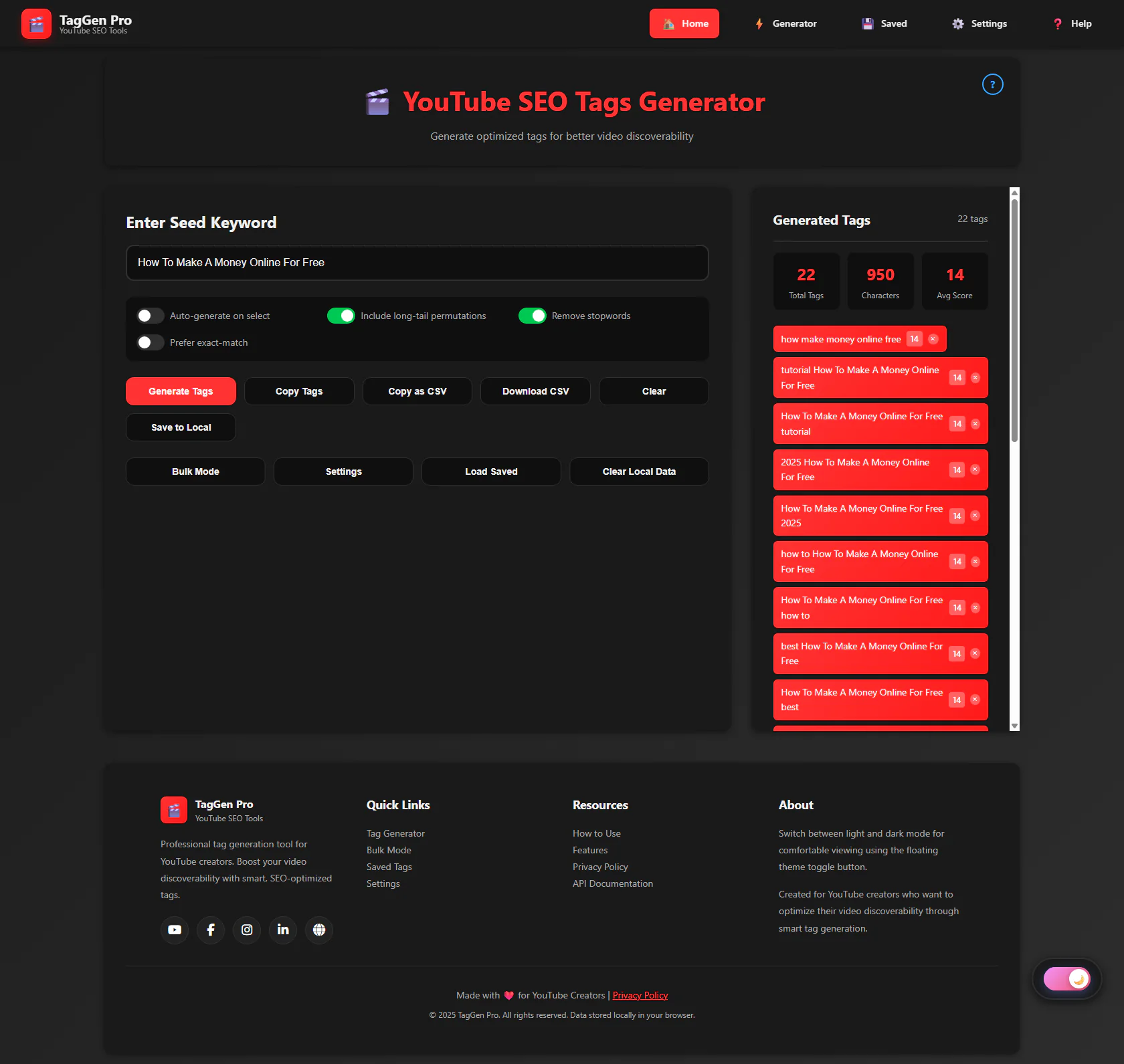 With a dark & light UI, data saving system, bulk mode, and API integration option, TagGen Pro is a complete and professional solution for anyone who wants to improve their YouTube SEO workflow.