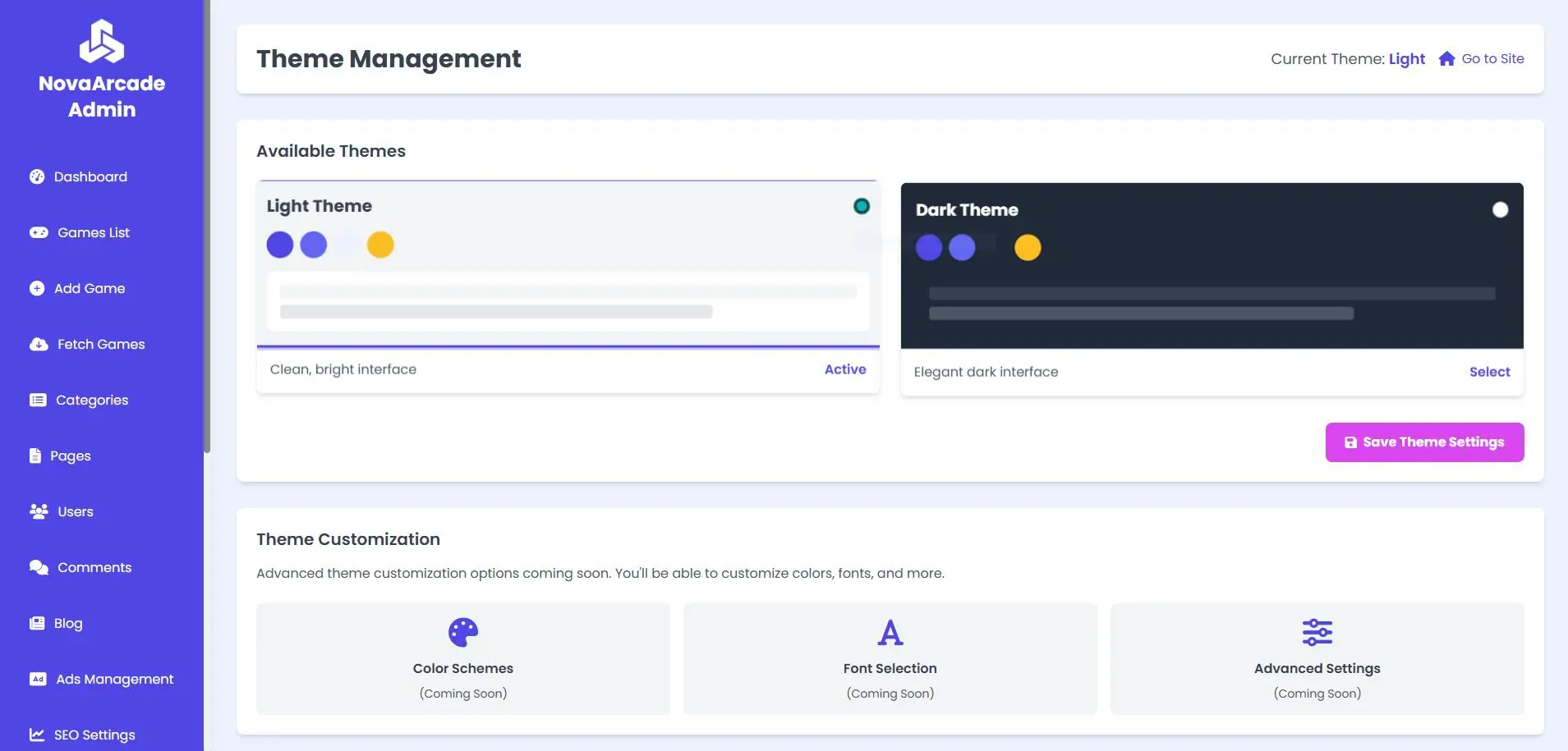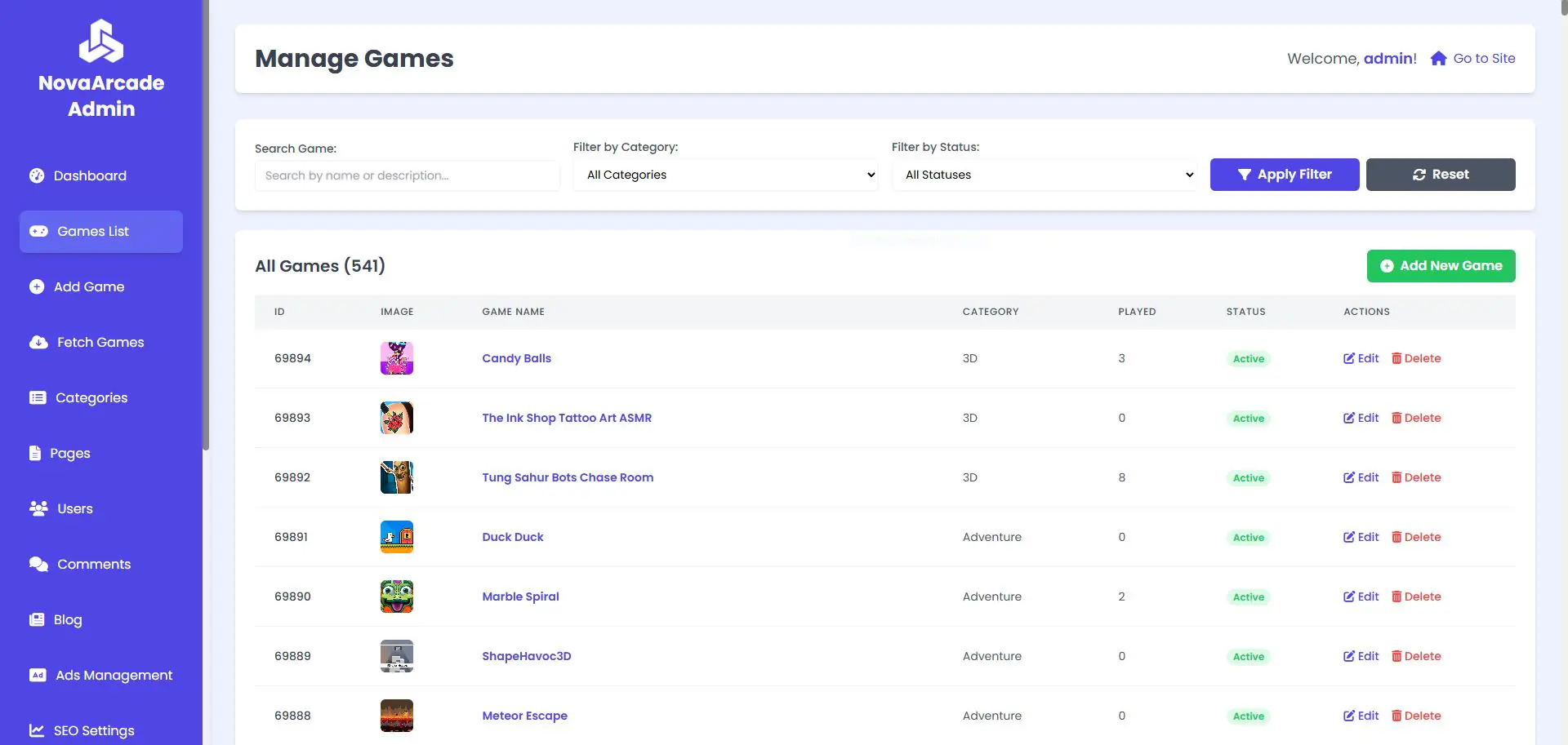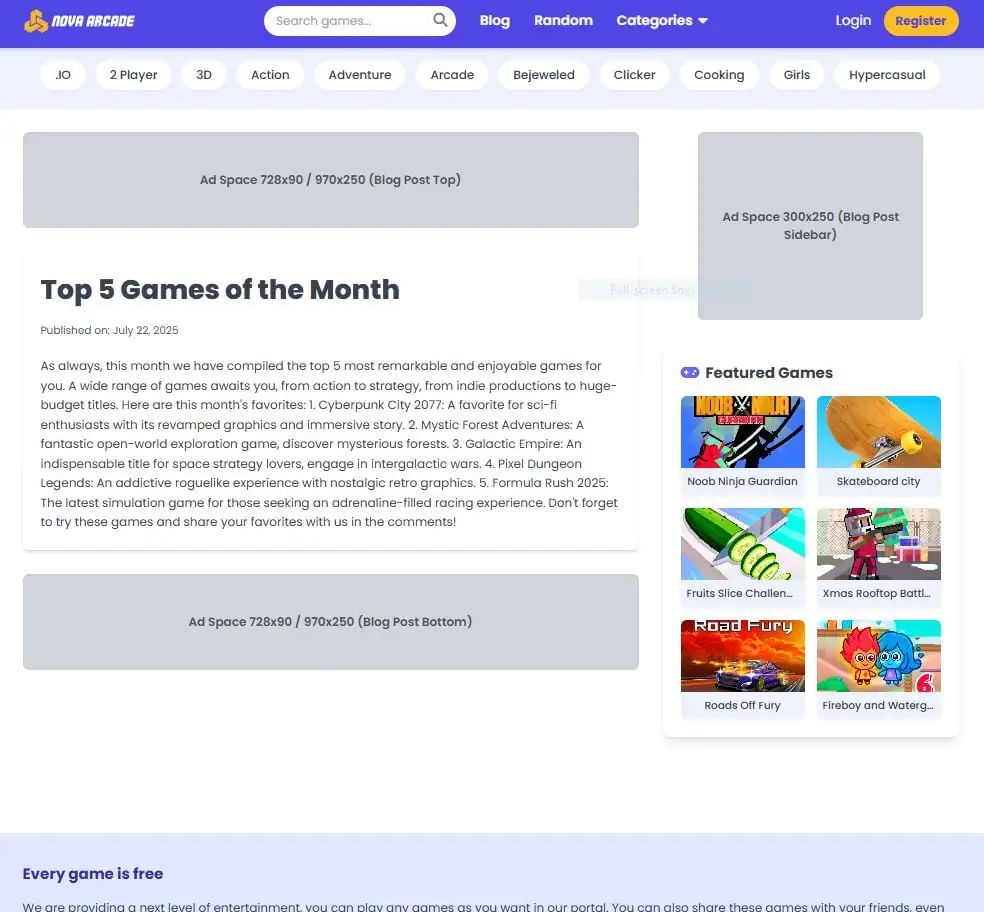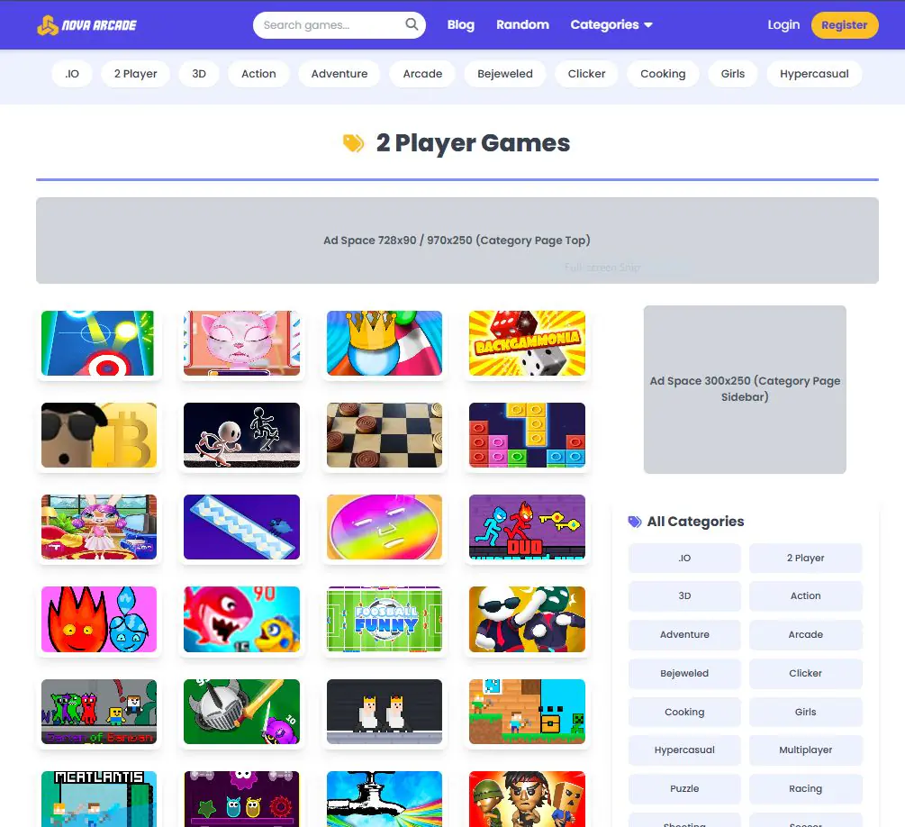 With a modern, responsive design powered by Tailwind CSS, a secure admin panel, blog system, built-in ad manager, and flexible layout themes โ Nova Arcade is your all-in-one solution to build, manage, and scale a successful game portal.