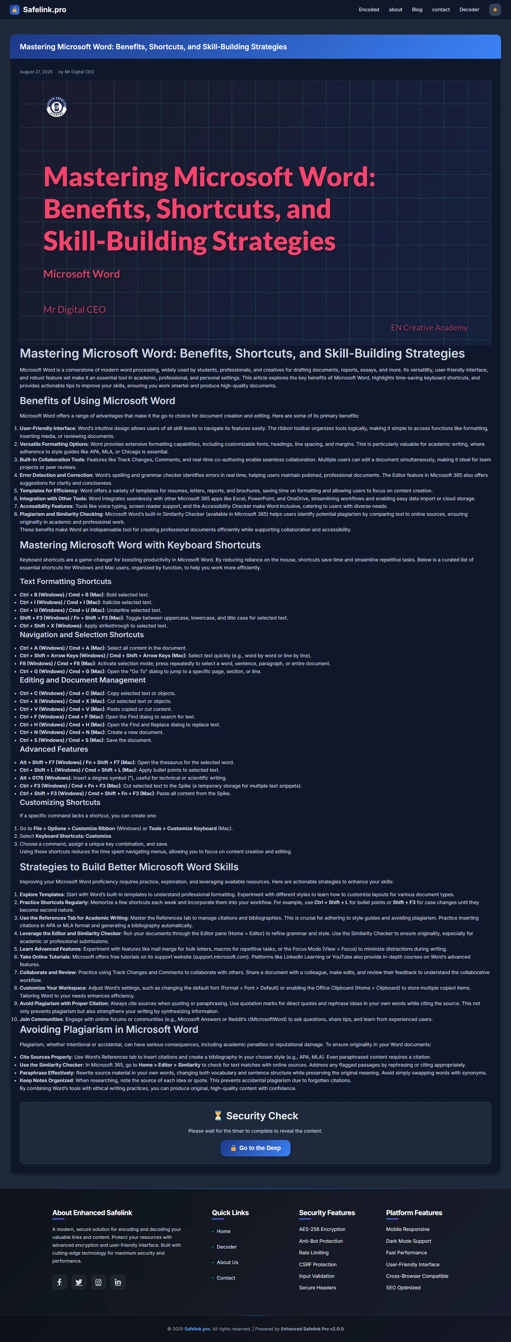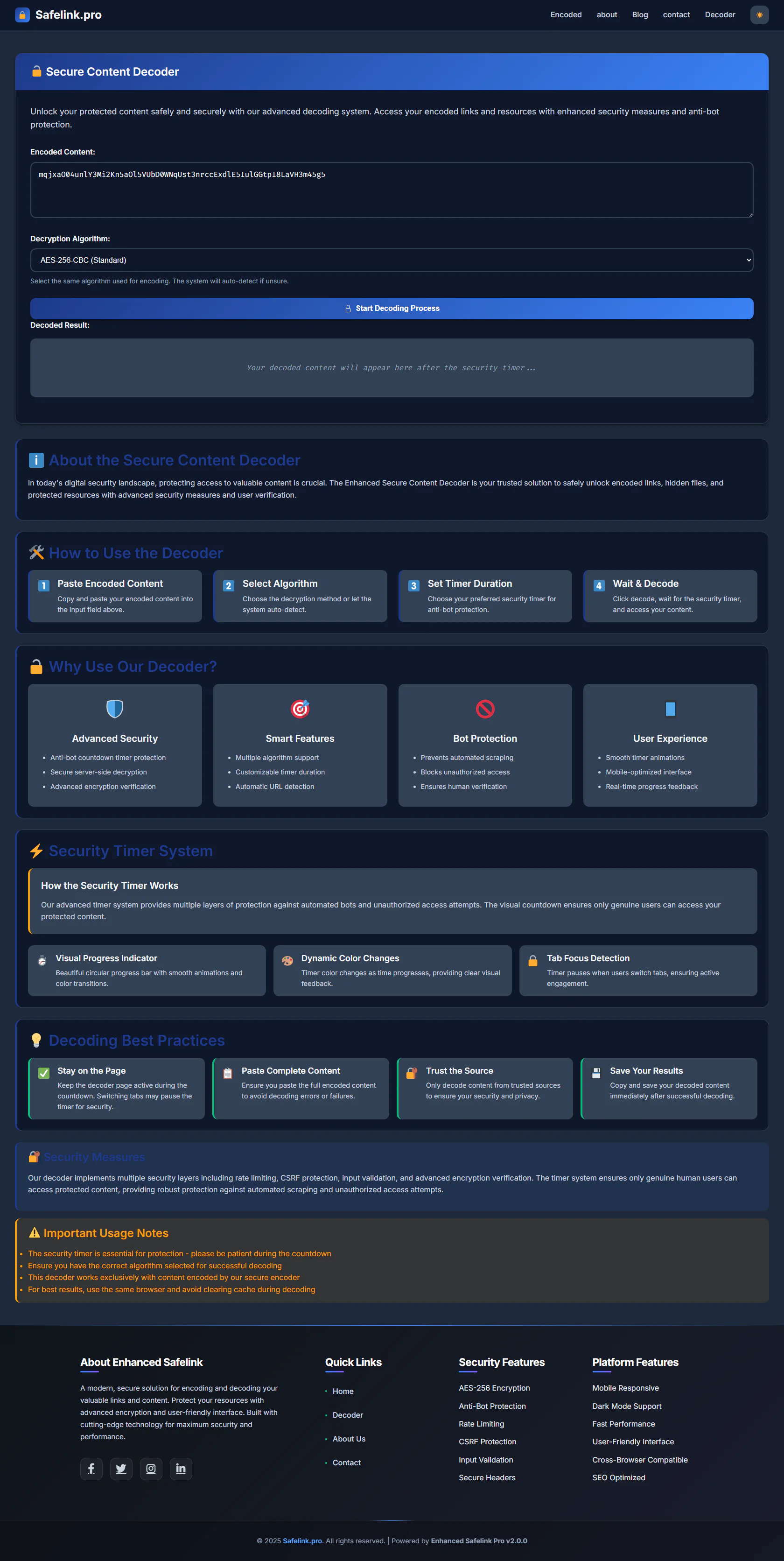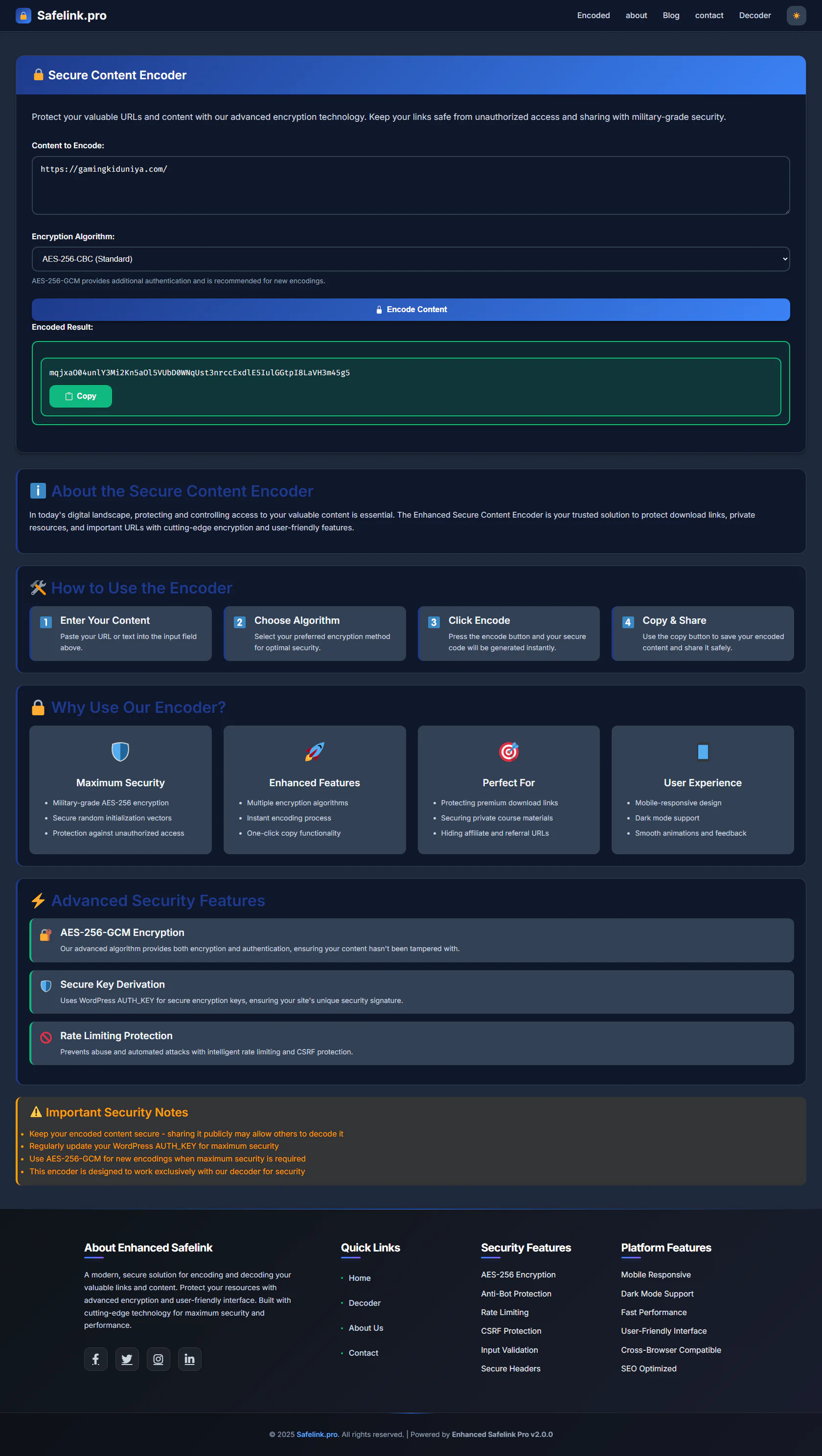Safelink Pro provides a professional, dark-mode responsive design, enhanced user experience, and optimized performance across all devices and browsers. It includes features like multiple encryption options, secure key derivation, and CSRF protection to ensure your encoded content stays safe from unauthorized access.