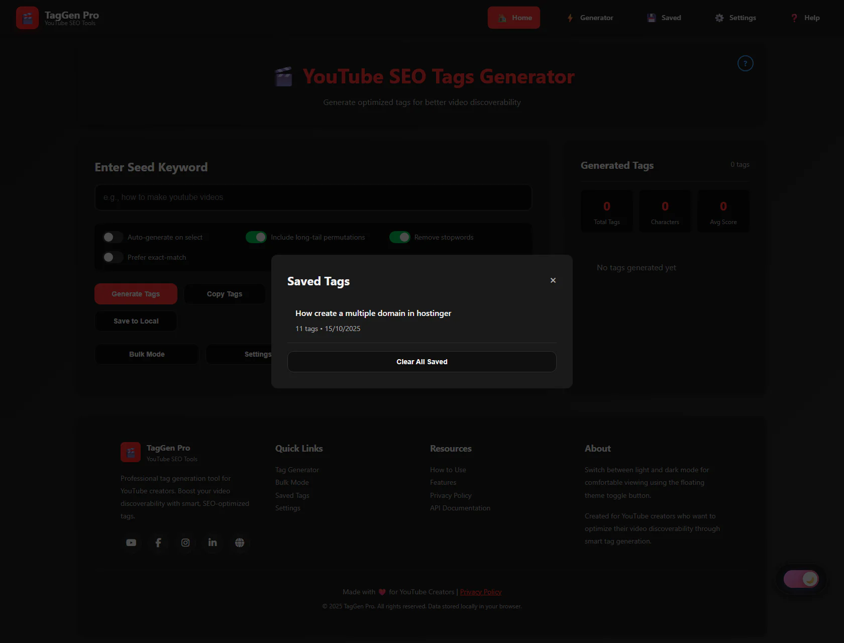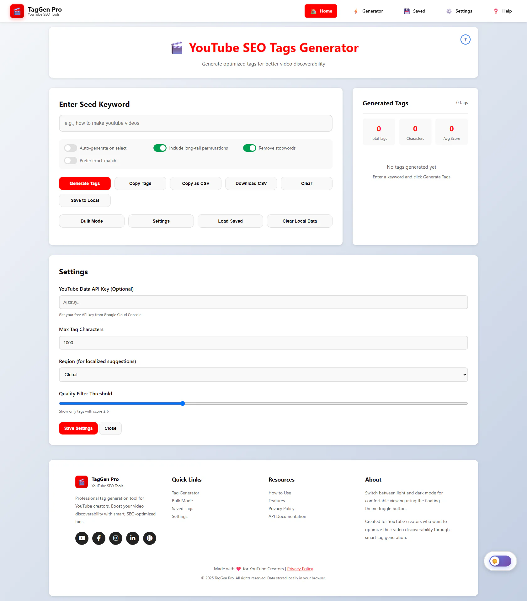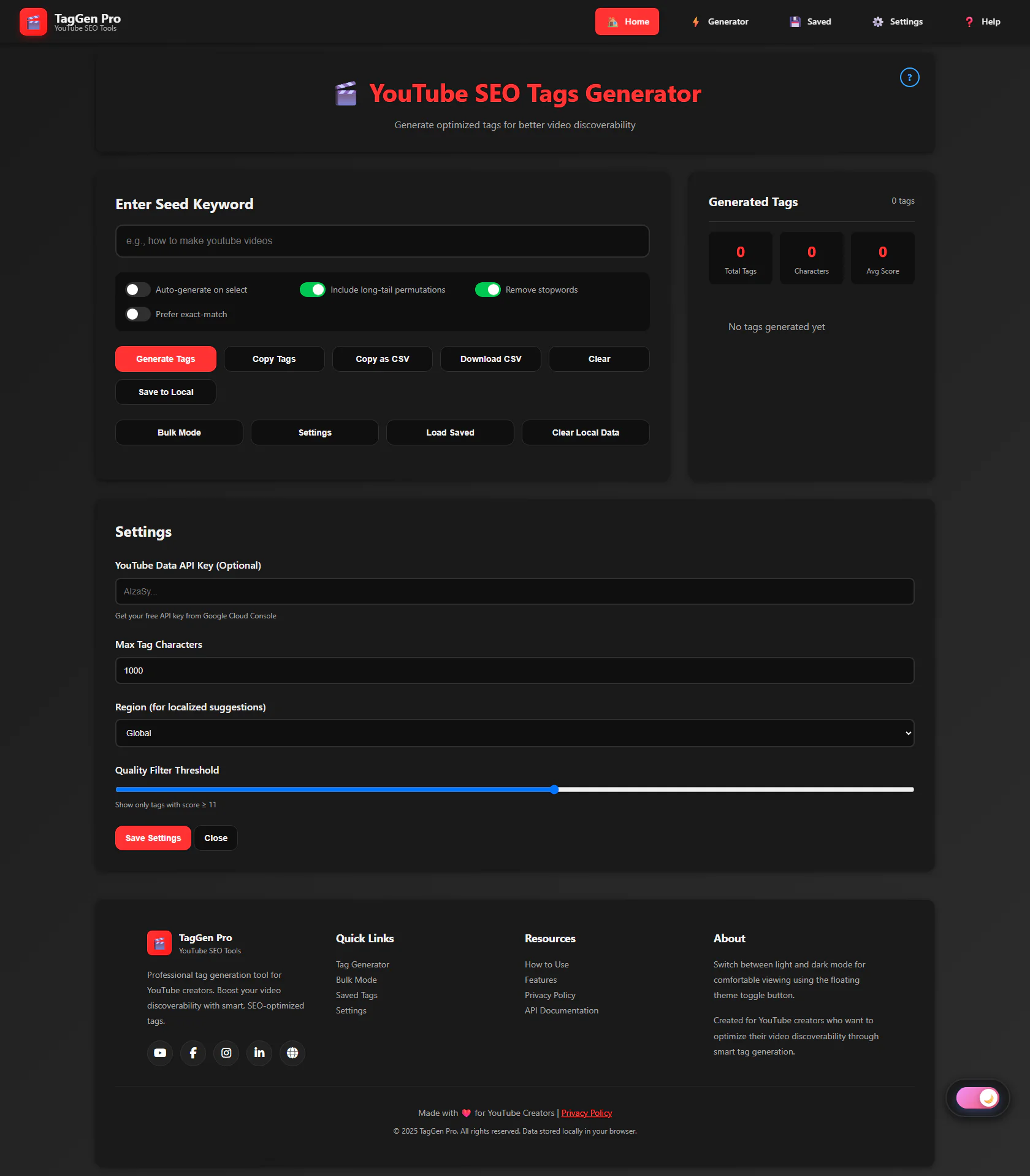 With a dark & light UI, data saving system, bulk mode, and API integration option, TagGen Pro is a complete and professional solution for anyone who wants to improve their YouTube SEO workflow.