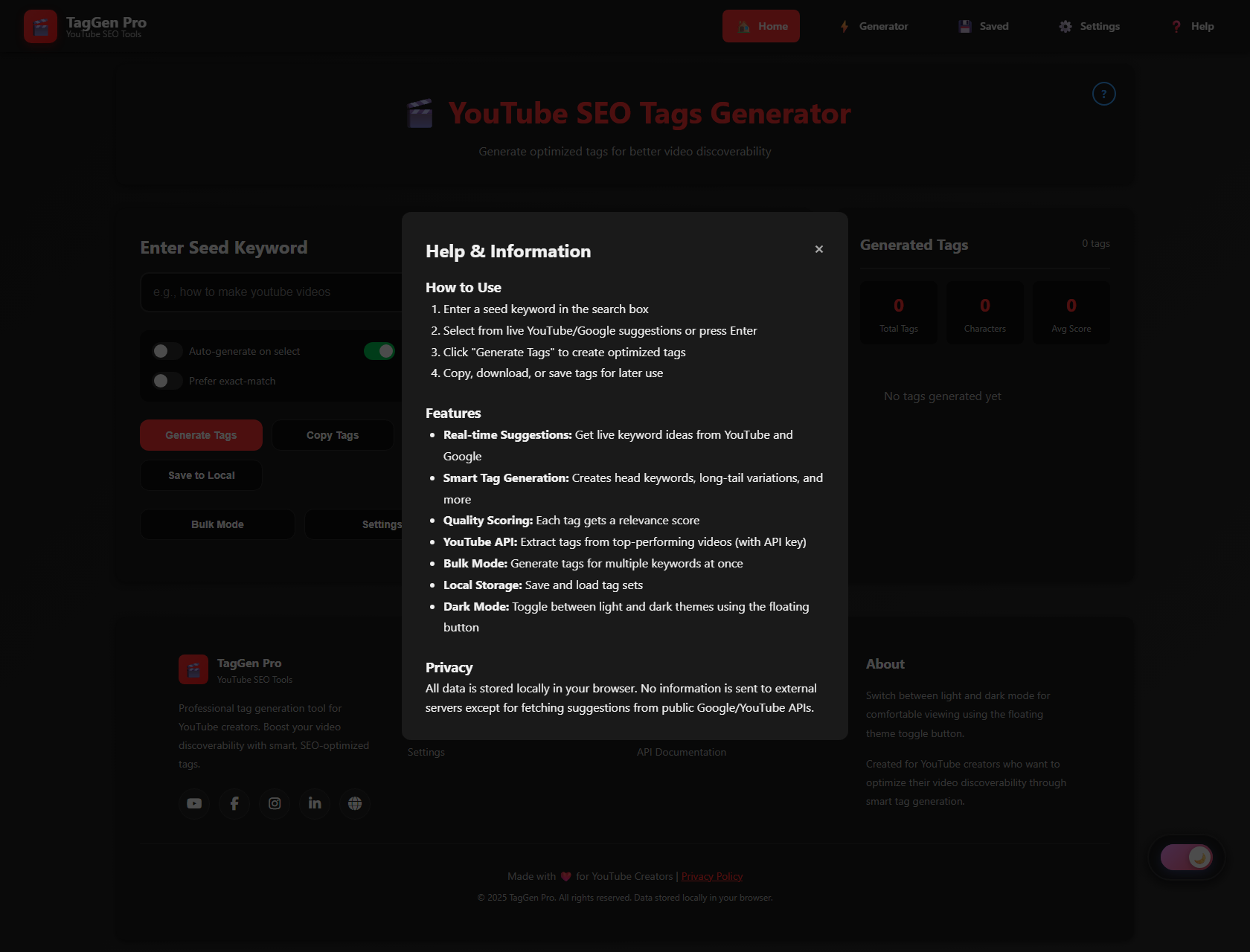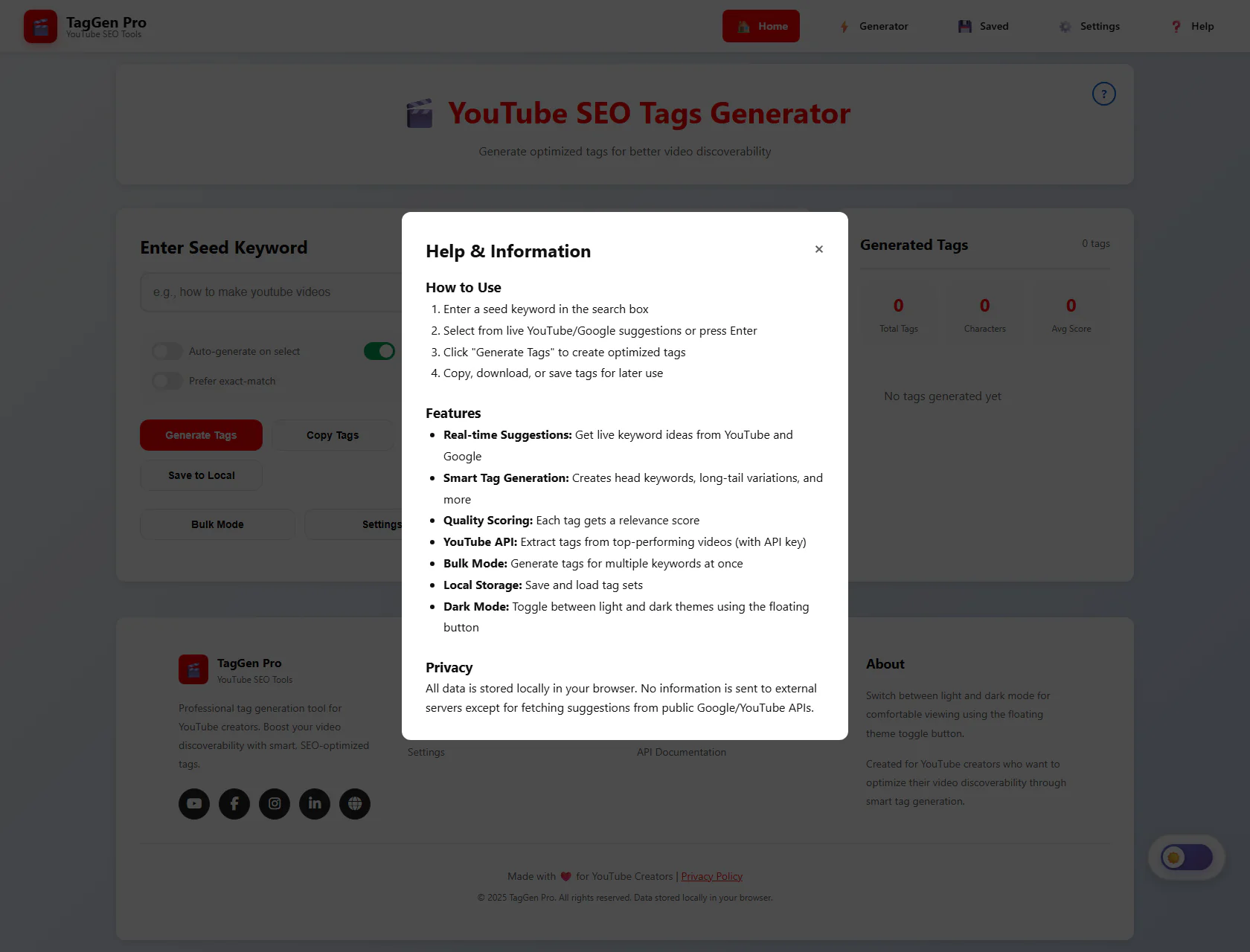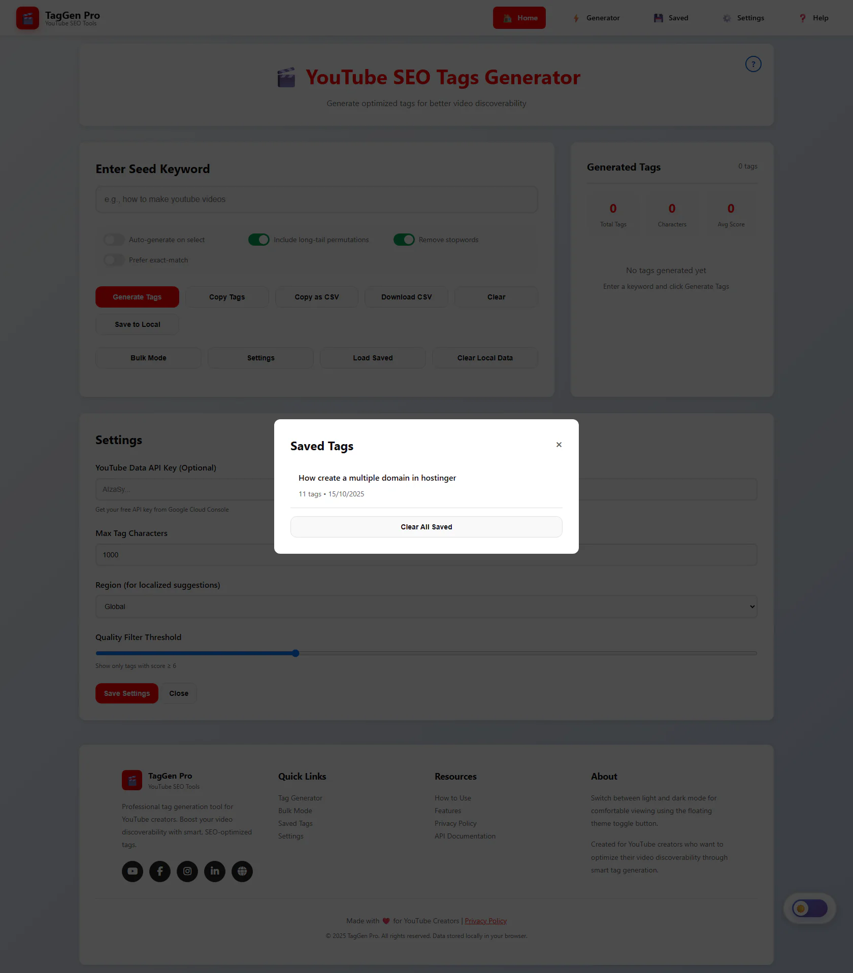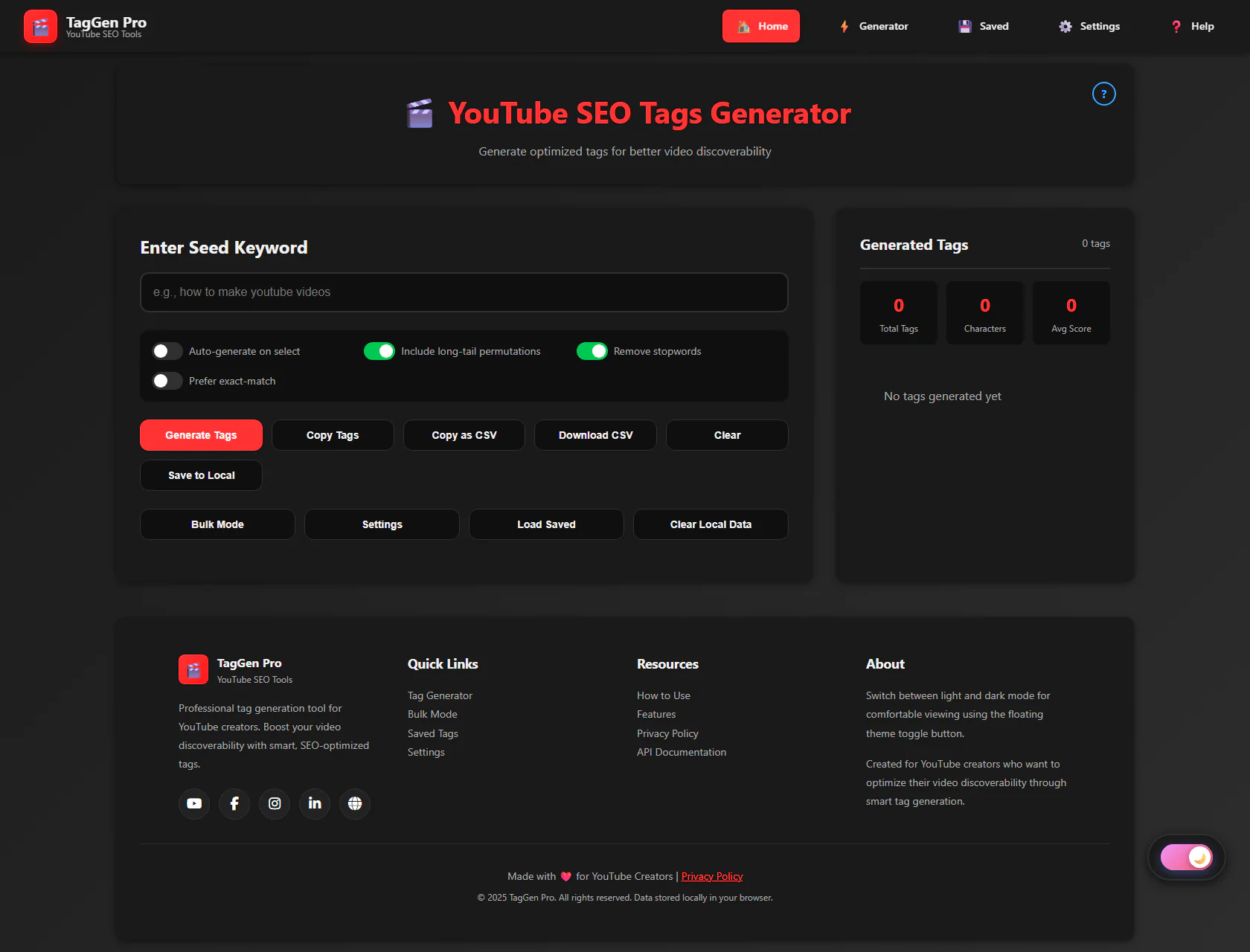 With a dark & light UI, data saving system, bulk mode, and API integration option, TagGen Pro is a complete and professional solution for anyone who wants to improve their YouTube SEO workflow.